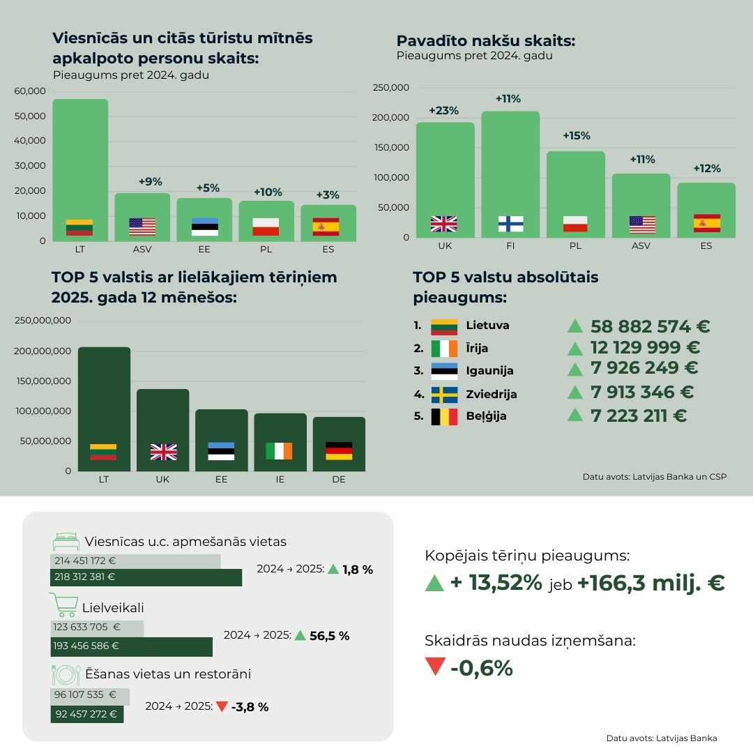 Ekonomiskais pienesums no tūrisma nozares 2025. gadā ir audzis ievērojami straujāk par pašu viesu skaitu. Kopējais tūristu tēriņu pieaugums Latvijā sasniedzis 13,5%, kas naudas izteiksmē veido 166,3 miljonus eiro. Analizējot tēriņu dinamiku, lielākais pieaugums vērojams no viesiem, kuri ieradušies no Lietuvas, Īrijas, Igaunijas, Zviedrijas un Beļģijas. Savukārt visstraujākais pavadīto nakšu skaits fiksēts viesiem no Apvienotās Karalistes, kur pieaugums sasniedzis 23%.