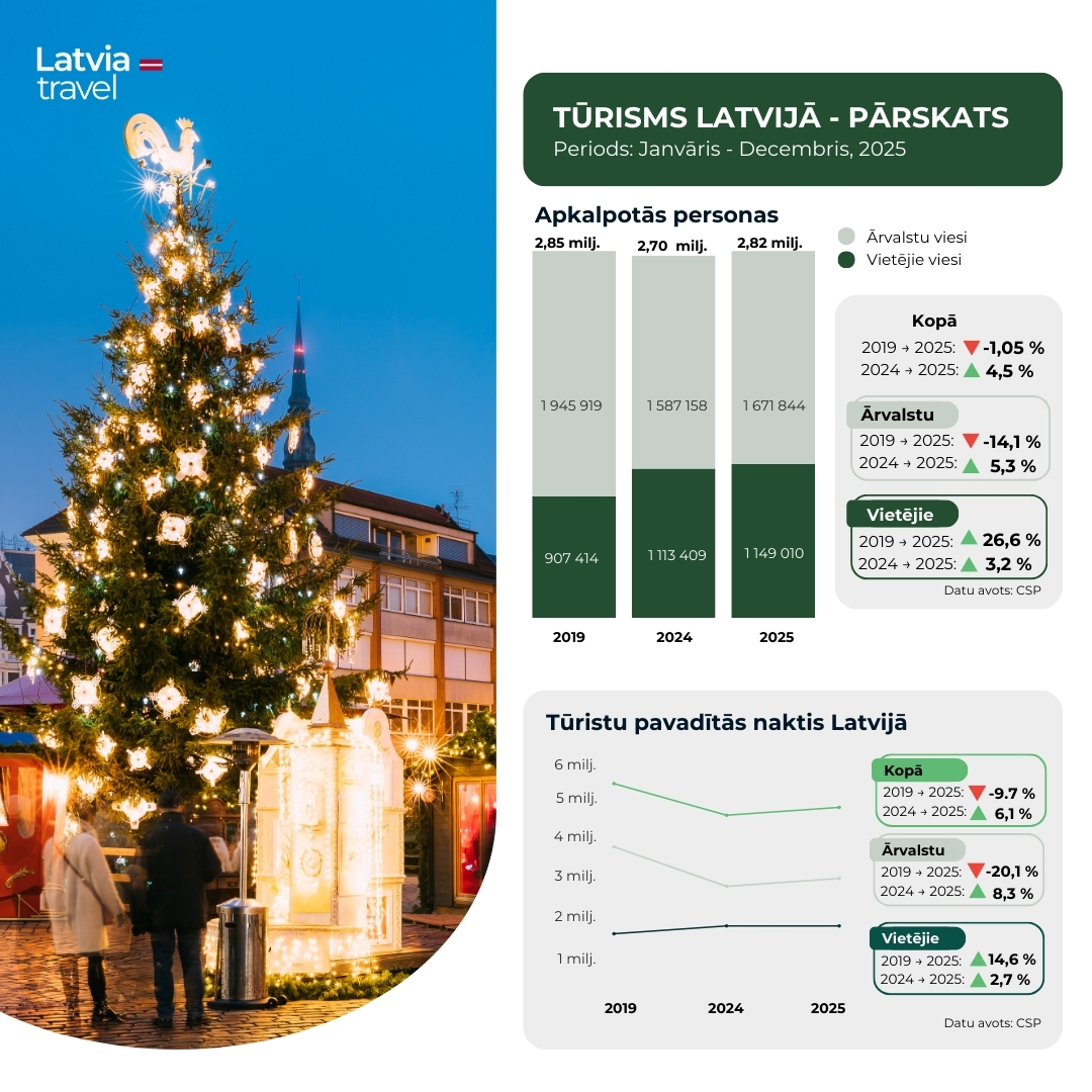 Latvijas tūrisma nozare 2025. gadā uzrādījusi pārliecinošu izaugsmi, sasniedzot 2,82 miljonus apkalpoto viesu tūristu mītnēs. Tas ir par 4,5% vairāk nekā gadu iepriekš, ko veicinājusi gan ārvalstu, gan vietējo ceļotāju aktivitāte. Nozarei kopumā šis ir bijis stabils attīstības posms, kurā pozitīvas tendences vērojamas visos galvenajos rādītājos.