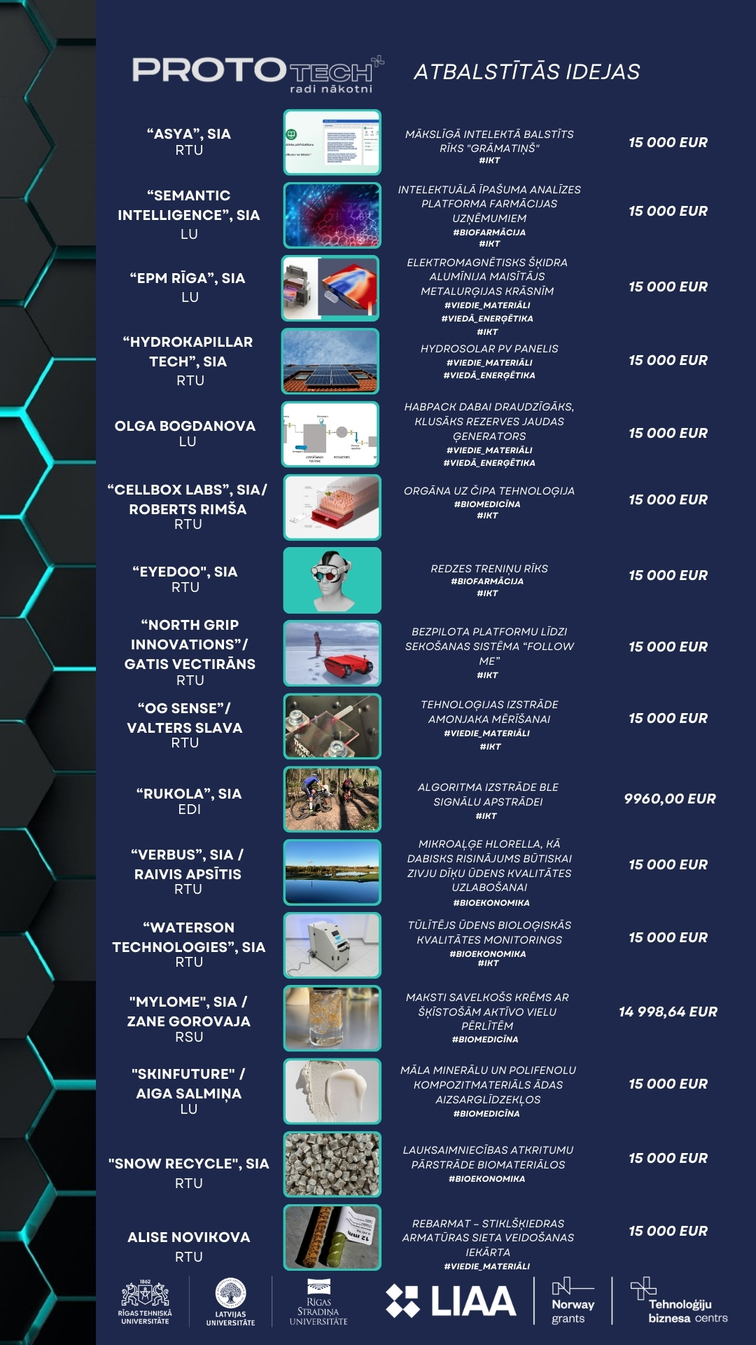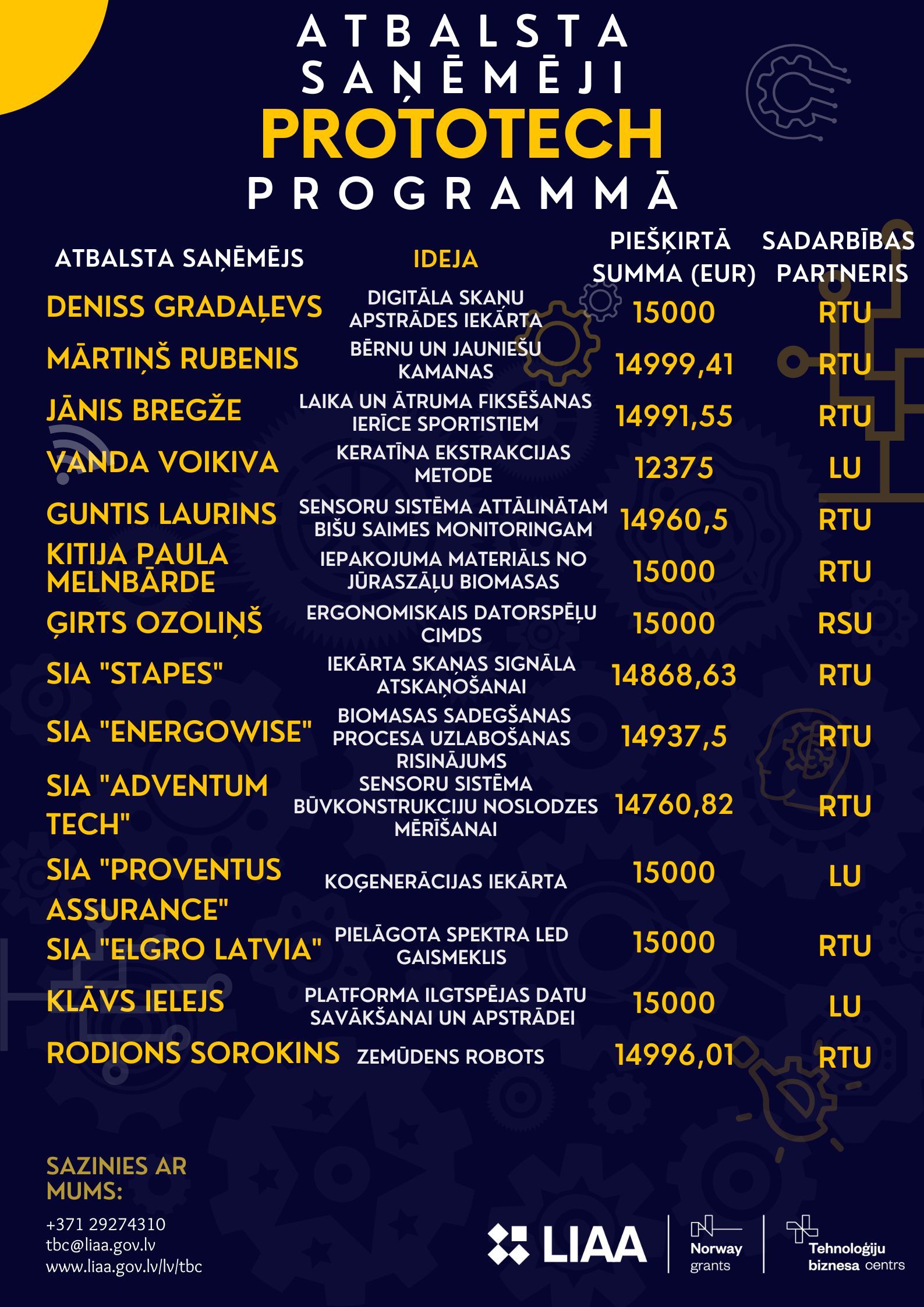 LIAA Tehnoloģiju biznesa centra prototipēšanas programma PROTOTECH sniedz atbalstu inovatīvi un tehnoloģiju intensīviem maziem un vidējiem uzņēmumiem, un fiziskām personām zinātņietilpīgu tehnoloģiju produktu vai pakalpojumu prototipu izstrādē un attīstībā, minimālā dzīvotspējīga produkta izstrādes procesam. PROTOTECH programma ir veidota sadarbībā ar 3 vadošajām Latvijas universitātēm, kas ir šīs programmas oficiālie sadarbības partneri – Latvijas Universitāte, Rīgas Tehniskā universitāte un Rīgas Stradiņa universitāte, taču prototipu var izstrādāt arī cita pētniecības institūcija ar atbilstošu specializāciju un kompetenci, ņemot vērā tās tehniskās iespējas un kapacitāti.